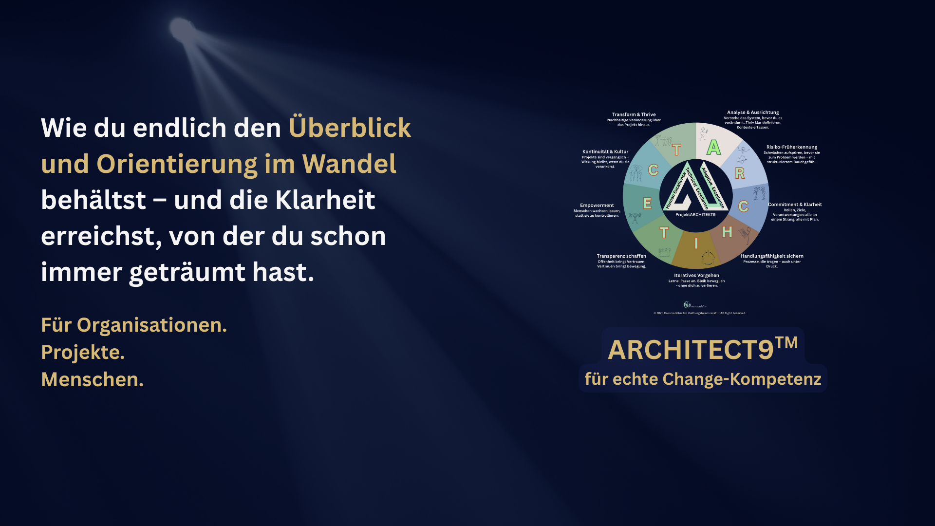 Genau das ermöglicht ARCHITECT9TM – ein Kompass, der Veränderung lesbar macht, Orientierung schenkt und den Unterschied zwischen Verirren und Vorankommen schafft. Es verbindet emotionale Klarheit mit professioneller Struktur – und macht Wandel nicht nur möglich, sondern wirksam.